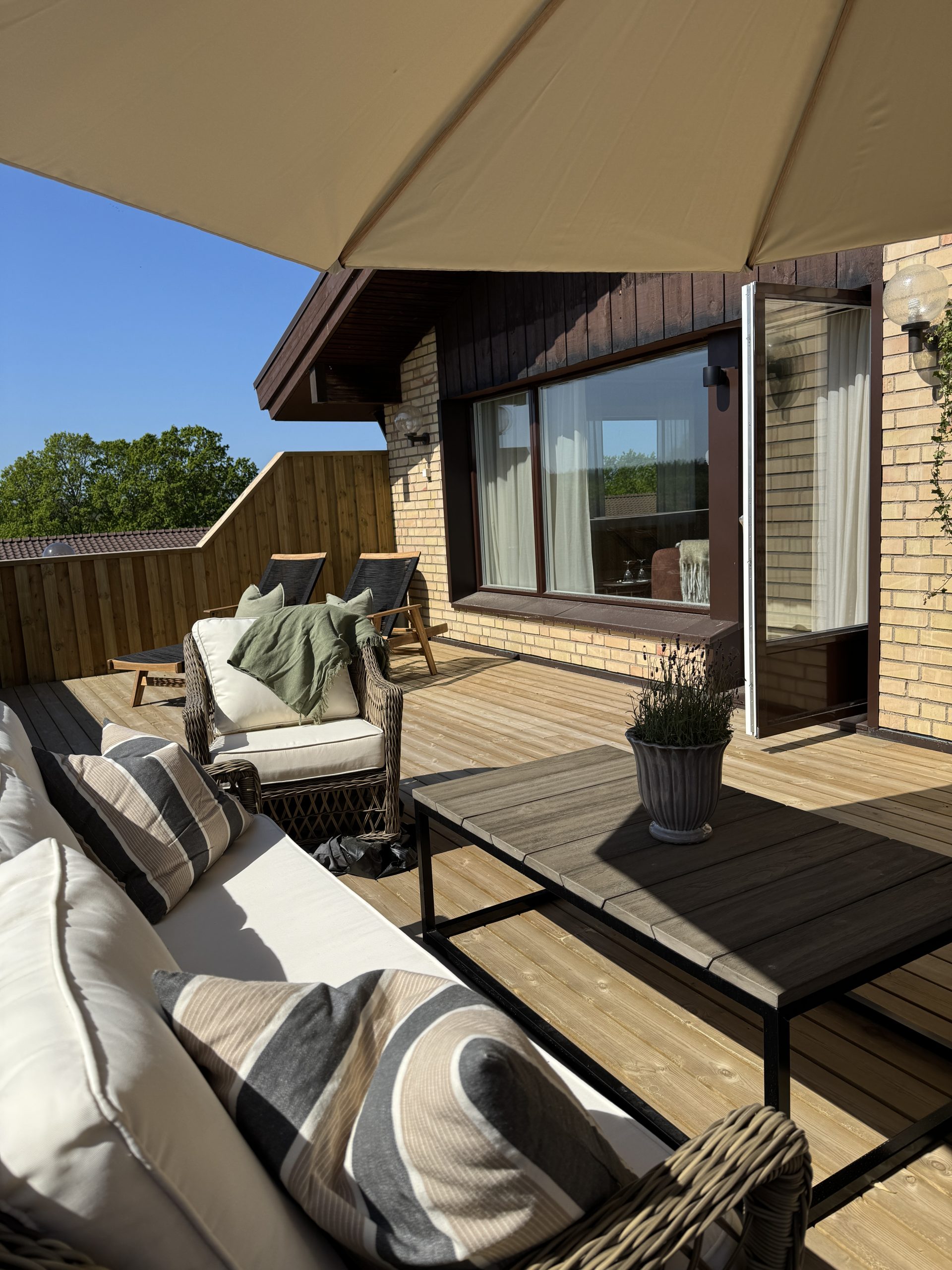 Till brudparet har vi ett vackert rum uppe på Tallhöjden. Rummet är helt nybyggt och invigdes i mars 2025. Här finns gott om plats, skön dubbelsäng och en stor privat uteterrass på hela 45 kvm, med härlig loungegrupp, solstolar, parasoll och sköna kuddar. Härifrån har du badrocksavstånd till stranden och panoramavy över hela Skåvsjöholmsviken.