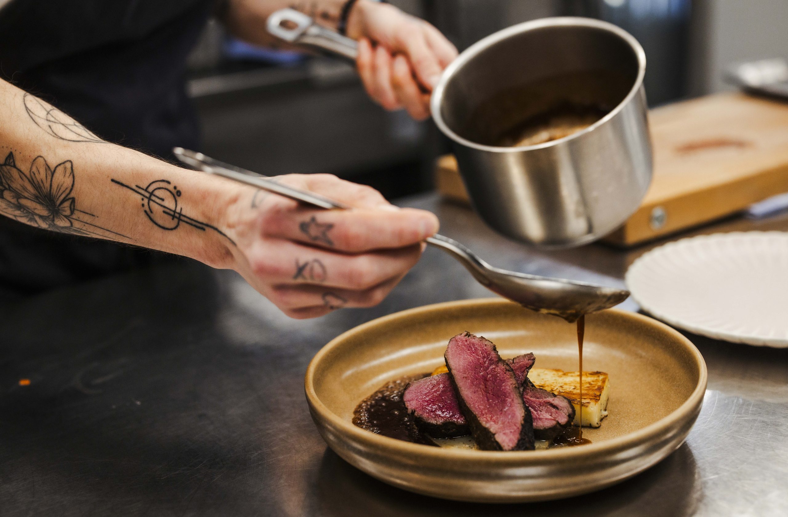 – Min filosofi är att det alltid måste vara riktigt gott, oavsett om det är en mustig svampsoppa, en grillad gös eller en saftig biff. Och med tanke på vart världen är på väg känns det också viktigt att bidra till en grönare framtid. Tillsammans med mitt fantastiskt duktiga team får jag chansen att göra detta! Det bästa jag vet är när gästerna utbrister ”Satan, vad gott det va’” säger köksmästare Jonathan Birgersson.